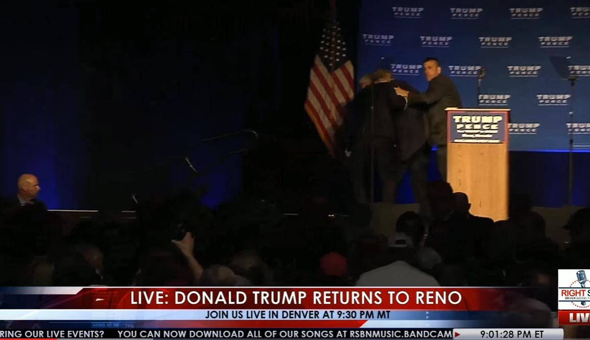 Republican Nominee for President Donald Trump was giving a speech at a packed arena of at least 6,500 attendees in Reno, Nevada, when he was quickly rushed off stage by Secret Service after rally goers were yelling that a protester appeared to “had a gun”. Which later turned out later to be a false claim.