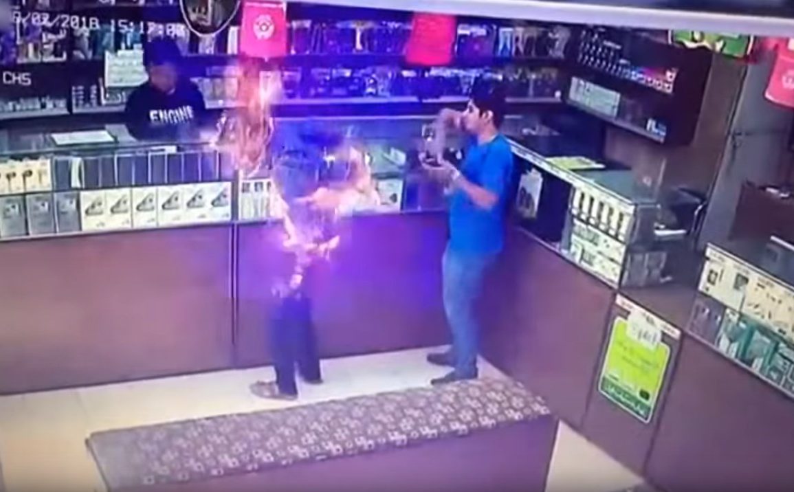 The amazing explosion can be seen on the shops security cam footage, which shows one of the men triggering the explosion by lighting a cigarette.