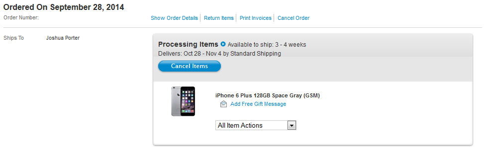 My order is still “processing”. Sad thing is, I could cancel the order, and reorder the normal iPhone 6 and have it in my hands within a week, but meh, I’d rather wait for the Plus. Hopefully it comes before Halloween… Or Thanksgiving…
