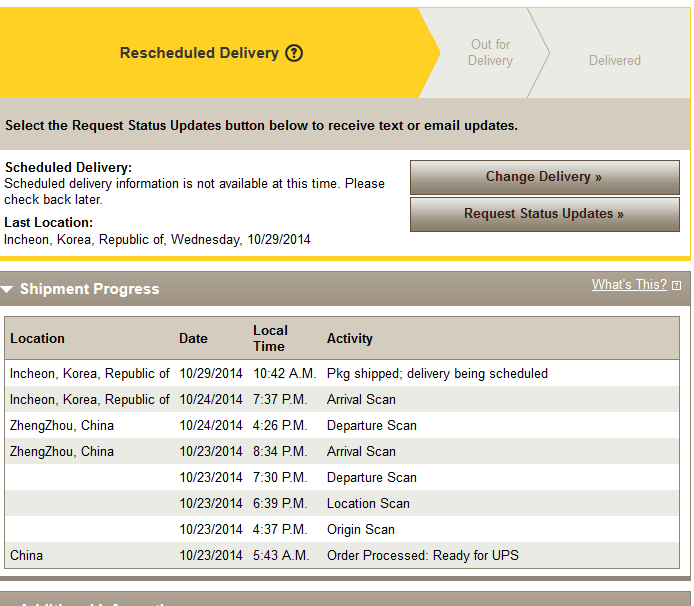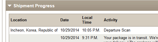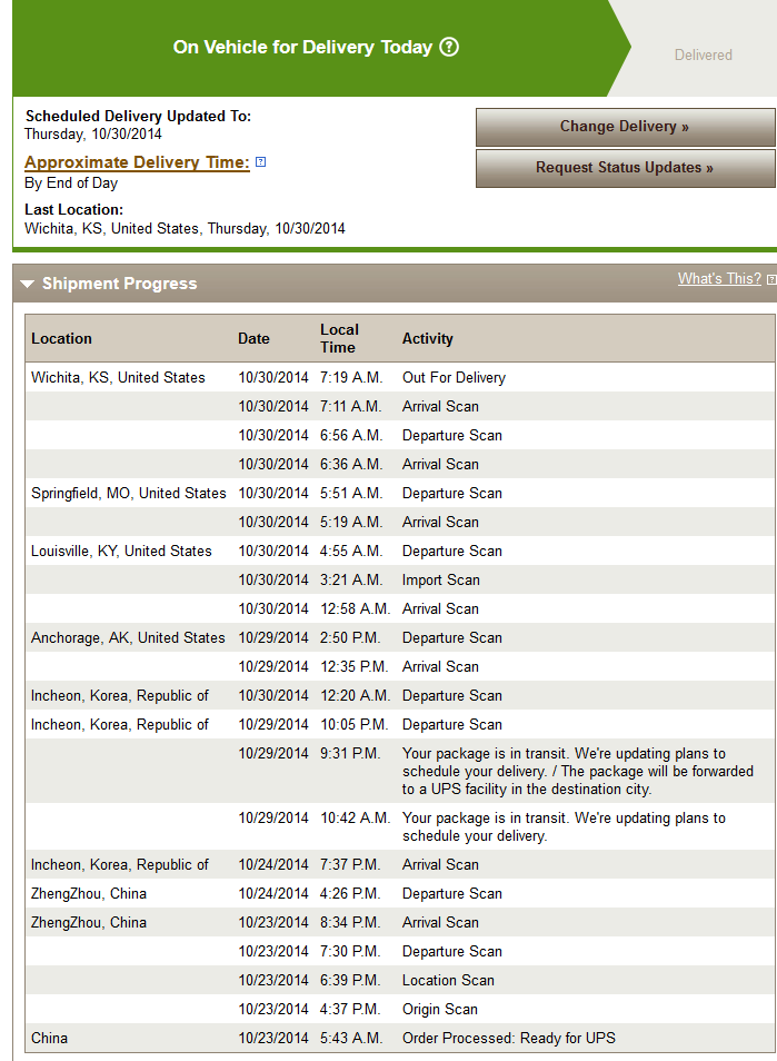 Just a few minutes ago the order switched to “Shipped”, and I have a UPS tracking code, with an expected delivery of October 29th, which is less than a week from now, and 2 days into the original expected delivery dates of Oct 28 – Nov 4th.