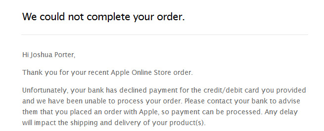 Yesterday after waking up from an prework afternoon nap (I’m an old man), this email popped up stating that my order could not be completed. WTF? the first words in bold made me think that all hope was lost. After waiting nearly a month, and then to get this? No way was I going to wait another month! Force Apple to take my $1,000?